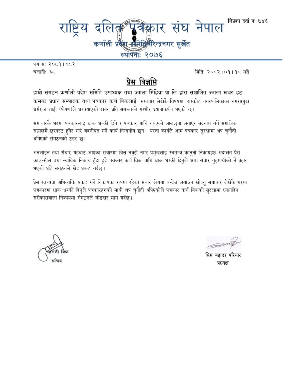 संघका कर्णाली प्रदेश अध्यक्ष भिम बहादुर परियार र सचिव मालती विकले बुधवार एक प्रेश विज्ञप्ति जारी गरी समाचार लेखेकै विषयमा रास्कोट नगरपालिकाका नगरप्रमुख धर्मराज शाही (पोषण)ले धम्क्याएको विषयमा गम्भीर ध्यानाकर्षण भएको भन्दै निन्दा गर्नु भएको हो ।