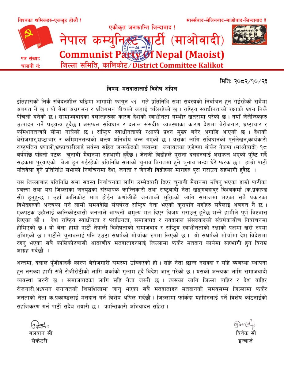 नेकपा माओवादीले चुनावी संघर्षको मोर्चामा देश विदेशमा रहनु भएका सबै कालिकोटबासी आदरणीय मतदाताहरुलाई जिल्लामा फर्केर मतदान कार्यमा सहभागी हुन विनम्र आग्रह समेत गरेको छ ।