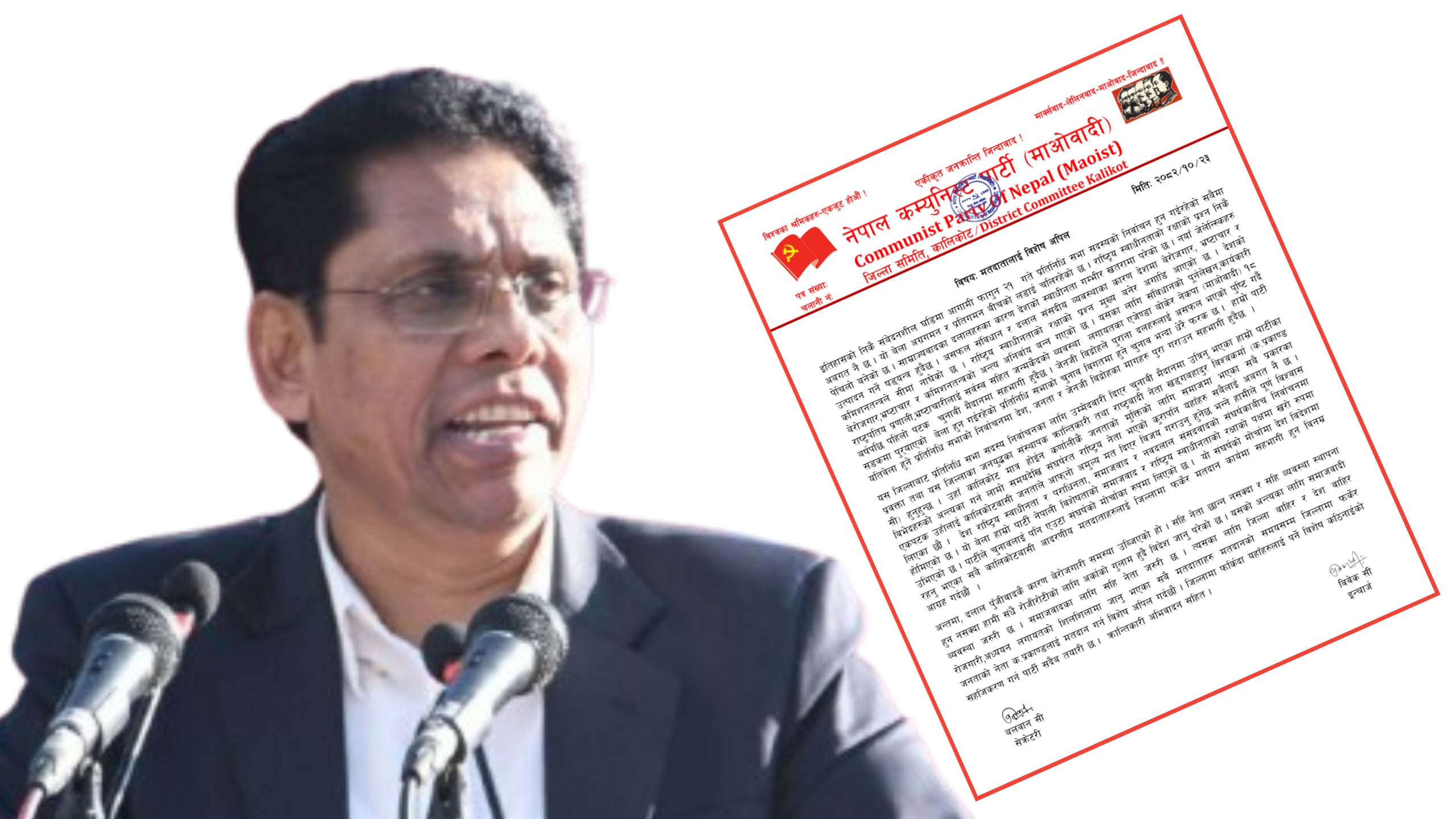 नेकपा (माओवादी)ले देश राष्ट्रिय स्वाधीनता र पराधिनता, समाजवाद र नवदलाल संसदवादबीच संघर्षमा होमिरहेका बेला आगामी फागुन २१ गते हुने निर्वाचनमा मतदाता अनिवार्य सहभागी हुन अपिल गरेको हो ।