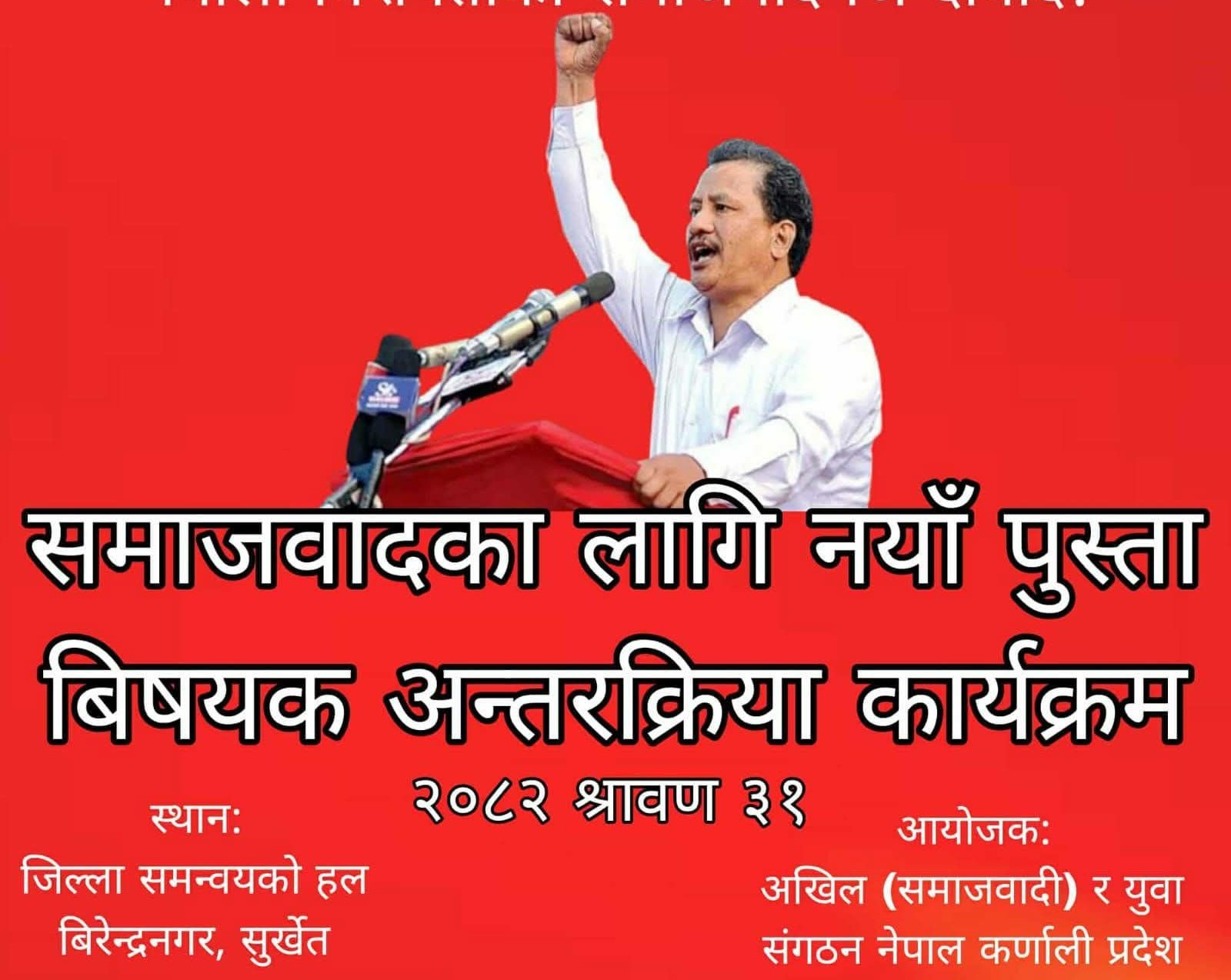 अखिल (समाजवादी) र युवा संगठन नेपालको संयुक्त आयोजनामा हुन लागेको अन्तरक्रिया कार्यक्रममा विभिन्न क्षेत्रका युवा विद्यार्थी,बुद्धिजीवी, व्यापारी,कर्मचारी तथा देशप्रति चिन्ता गर्ने व्यक्तिहरुलाई उपस्थितिका लागि विशेष निमन्त्रणा गरिएको छ ।