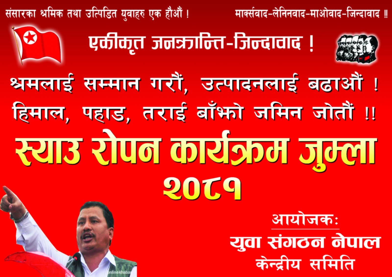 युवा संगठन नेपालले ‘श्रमलाई सम्मान गरौं, उत्पादनलाई बढाऔं,हिमाल,पहाड,तराई बाँझो जमिन जोतौं’भन्ने नारा दिएर स्याउ रोपन कार्यक्रम गर्न थालेको छ । यसले देश र जनतालाई देश र जनतालाई आत्मनिर्भर बनाउने लक्ष्य लिएको छ ।