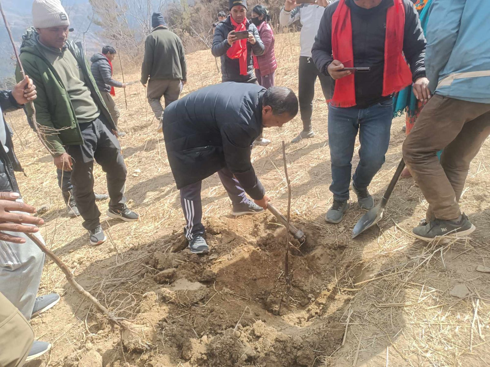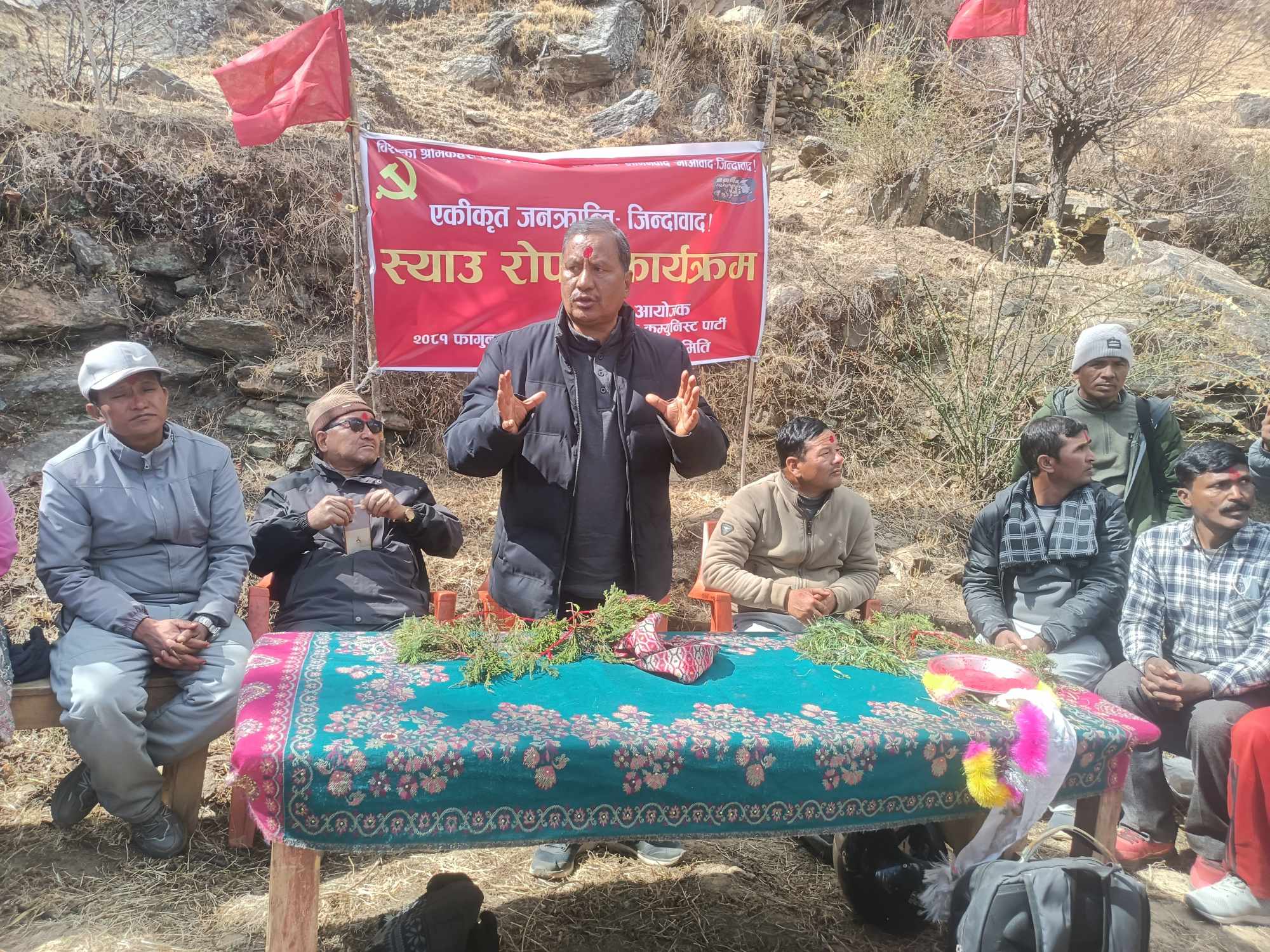 ‘हामी आत्मनिर्भर नेता कार्यकर्ता, पार्टी चाहान्छौ, आत्मनिर्भर देश र जनता चाहान्छौ’ महासचिव विप्लवले भन्नु भयो, ‘जसका लागि नेकपा देशभर उत्पादनमा लागेको छ, त्यसको निरन्तरतामा जुम्लामा स्याउ रोपिरहेको छ, गतवर्ष पनि हामी जुम्लामा स्याउ रोप्न पुगेका थियौ । अहिले पनि रोप्दै छौ ।’