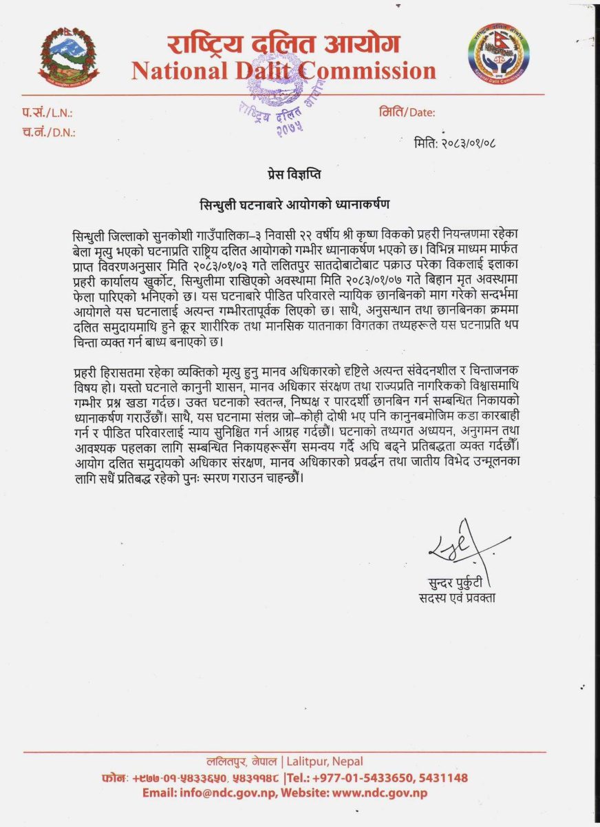राष्ट्रिय दलित आयोगले श्रीकृष्ण विकको प्रहरी हिरासतमा मृत्यु भएको भनिएको घटनाप्रति गम्भीर ध्यानाकर्षण भएको जनाएको छ। बुधबार आयोगका प्रवक्ता एवम् सदस्य सुन्दर पुर्कुटीले विज्ञप्ति जारी गर्दै घटनालाई आयोगले गम्भीरपूर्वक लिएको बताएका छन्।