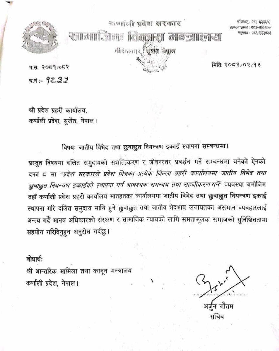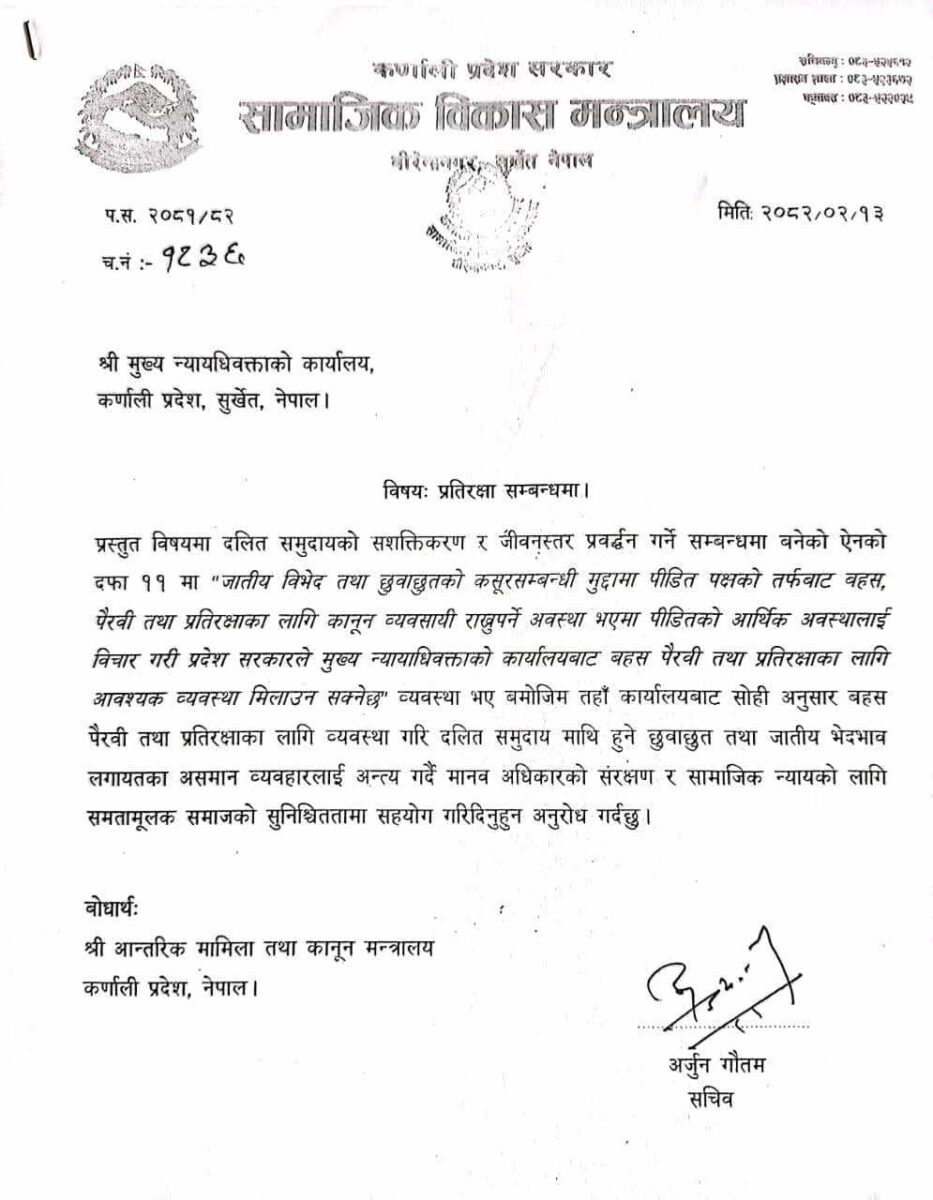मंगलवार सामाजिक विकास मन्त्रालयका सचिव अर्जुन गौतमको नाममा हस्ताक्षर गरि पठाएको पत्रमा जातीय कसुर र छुवाछुतको मुद्धामा पीडित पक्षको तर्फबाट वहस,पैरवी तथा प्रतिरक्षाको लागि कानून व्यवसायी राख्नु पर्ने अवस्था भएमा पीडितको आर्थिक अवस्थालाई विचार गरी प्रदेश सरकारले मुख्य न्यायधिवक्ताको कार्यलयबाट वहस पैरवी तथा प्रतिरक्षाका लागि आवश्यक व्यवस्था मिलाउन सक्नेछ भनि उल्लेख गरिएको छ ।