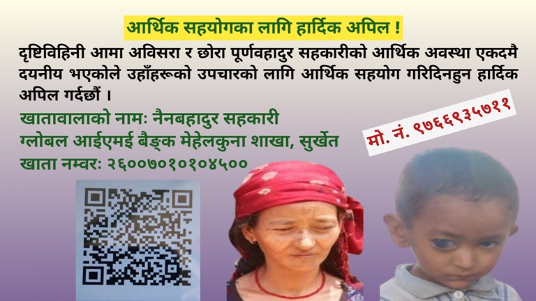 १७ जेठ, सुर्खेत । हामी सबैको लागि आँखा एउटा महत्वपूर्ण अंग हो । यदि आँखा भएन भने हाम्रो संसार अन्धकार हुन्छ । जन्मजात नै आँखाको समस्या हुनु र दृष्टिविहिन हुनु त स्वभाविक मान्न सकिएला । तर जन्मिसकेपछि संसार देख्ने राम्रो आँखा, रोग लाग्दा र आर्थिक अभावले उपचार गर्न नसेर दृष्टिविहिन हुदा यसको पीडा सामान्य हुदैन । त्यो पनि घरको एउटा सदस्यको मात्र होईन । एउटै घरका आमा र छोरा नै आर्थिक अभावले दृष्टिविहिन हुनु निकै पीडादायी विषय हो ।